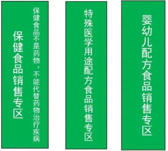 規(guī)范設(shè)立提示牌,醒目注明“保健食品銷售專區(qū)(專柜)”“嬰幼兒配方食品銷售專區(qū)(專柜)”“特殊醫(yī)學(xué)用途配方食品銷售專區(qū)(專柜)”字樣,提示牌為綠底白字,字體為黑體。