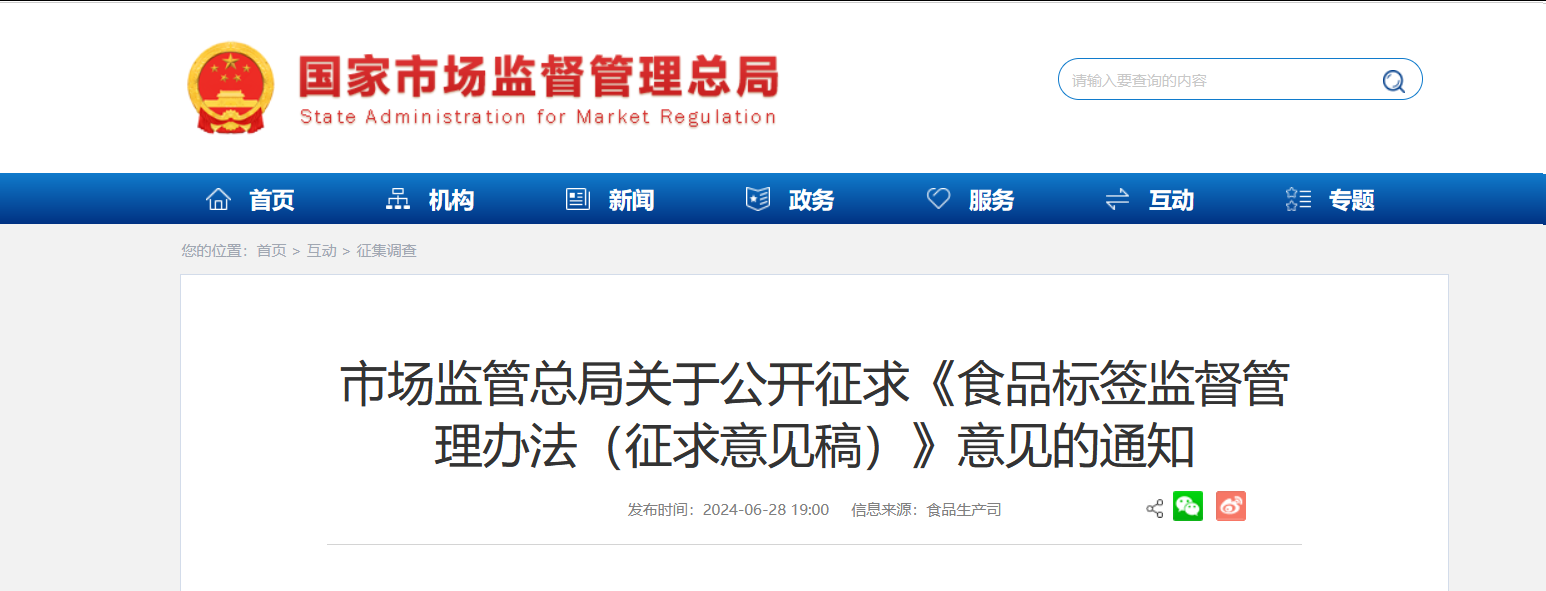 為了規(guī)范食品生產(chǎn)經(jīng)營者標(biāo)簽標(biāo)注行為,加強(qiáng)食品標(biāo)簽監(jiān)督管理,保障消費(fèi)者清晰辨識食品標(biāo)簽合法權(quán)益,根據(jù)《中華人民共和國食品安全法》及其實施條例等法律法規(guī),市場監(jiān)管總局起草了《食品標(biāo)簽監(jiān)督管理辦法(征求意見稿)》,現(xiàn)向社會公開征求意見,意見反饋截止日期為2024年7月27日。公眾可通過以下途徑和方式提出意見: