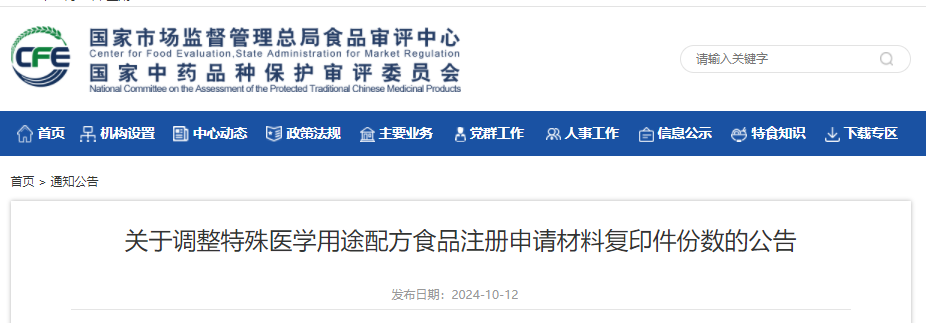 關于調整特殊醫(yī)學用途配方食品注冊申請材料復印件份數(shù)的公告
