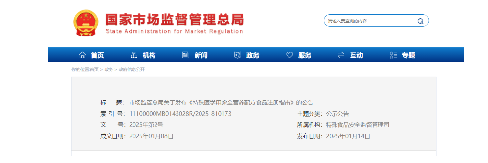 市場監(jiān)管總局關(guān)于發(fā)布《特殊醫(yī)學(xué)用途全營養(yǎng)配方食品注冊指南》的公告