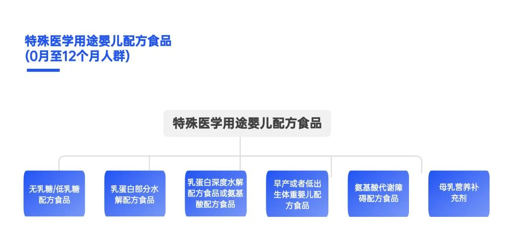 1歲以下人群的特醫(yī)食品,是指針對患有特殊紊亂、疾病或醫(yī)療狀況等特殊醫(yī)學狀況嬰兒的營養(yǎng)需求而設(shè)計制成的粉狀或液態(tài)配方食品。具體分類如下: